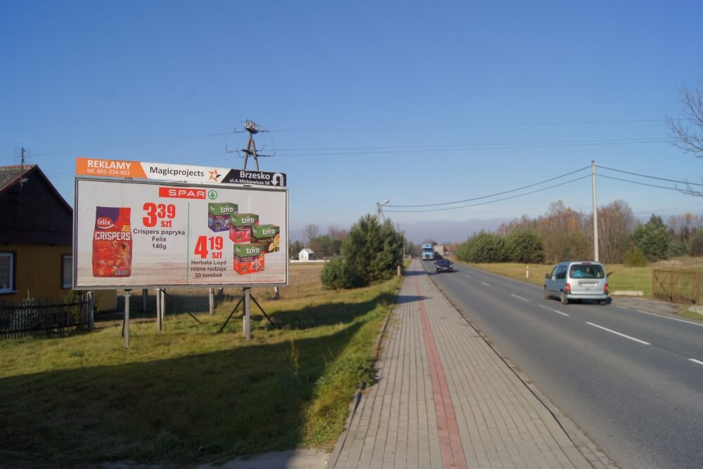 Tablica w miejscowości Uszew (4,2 km do Brzeska) skierowana do osób Jadących do Brzeska z Tymowej, Jurkowa, Nowego Sącza. Tablica znajduje się 500 metrów za czynnym fotoradarem w terenie zabudowanym, 100 metrów przed skrzyżowaniem. Billboard 12 m2 (5,04 x2,38m.)widoczny z 400 metrów.